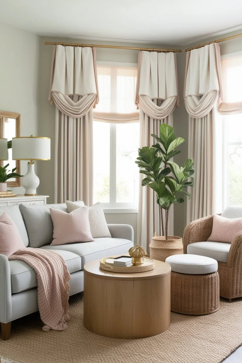 Soft, lightweight fabrics like linen-look curtains, airy sheers, and voile panels are ideal choices. They gently filter sunlight, add privacy, and keep the room feeling open rather than crowded. For more ideas tailored to compact layouts, you can also explore our article on Window Treatment Ideas for Small Living Room, which focuses on space-smart solutions.